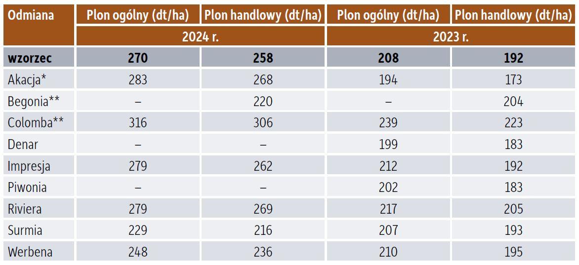 Wśród badanych 9 odmian bardzo wczesnych, zbieranych 40 dni po wschodach, w obu latach badań najwyższy plon ogólny uzyskała odmiana Colomba. W 2024 r. wyniósł on 316 dt/ha. W dwuleciu dobre wyniki osiągnęła także Riviera, natomiast dla Akacji bardziej korzystny okazał się sezon 2024 (tabela 1).