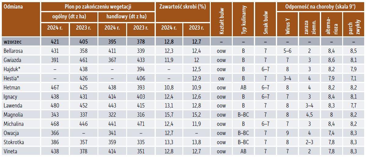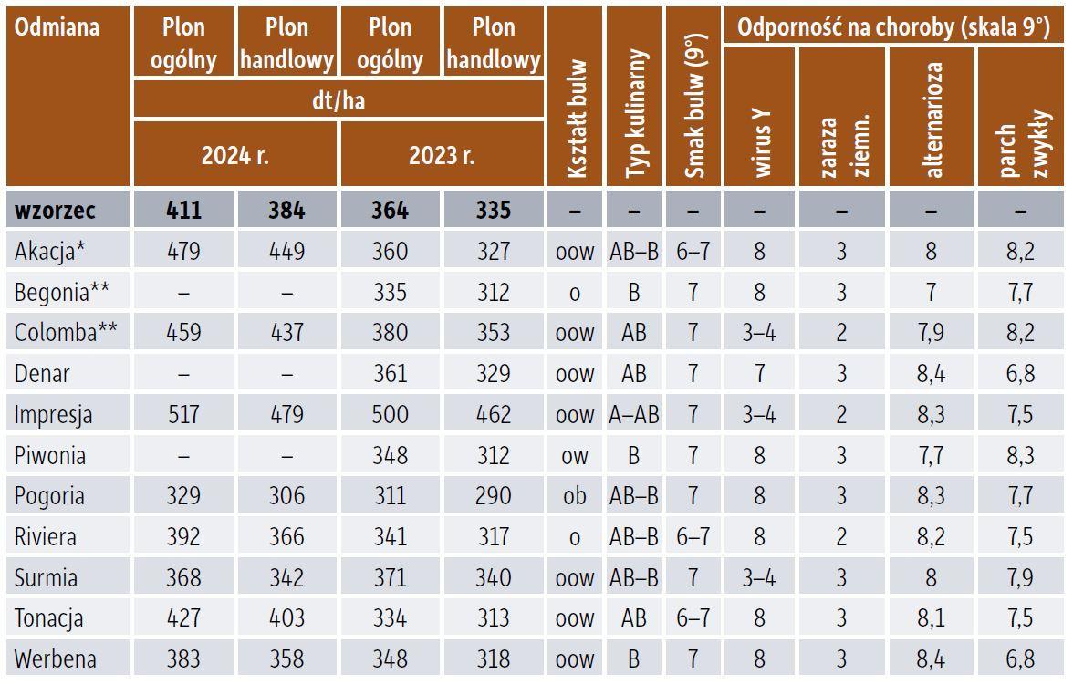 W tym ujęciu, także w dwuleciu, najwyższy plon ogólny i handlowy bulw osiągnęła odmiana Impresja. W 2024 r. jej plon ogólny wyniósł 517 dt/ha, a plon handlowy 479 dt/ha. Dobre wyniki odnotowały także Akacja, Colomba i Tonacja. Ta grupa odmian reprezentuje ponadto głównie dwa typy kulinarne, czyli sałatkowy (AB) i ogólnoużytkowy (B; tabela 2).