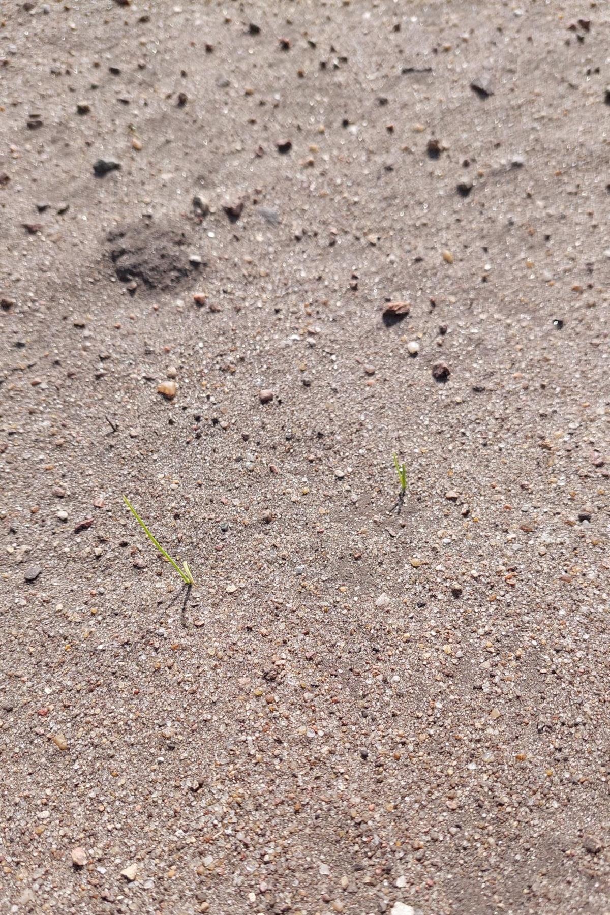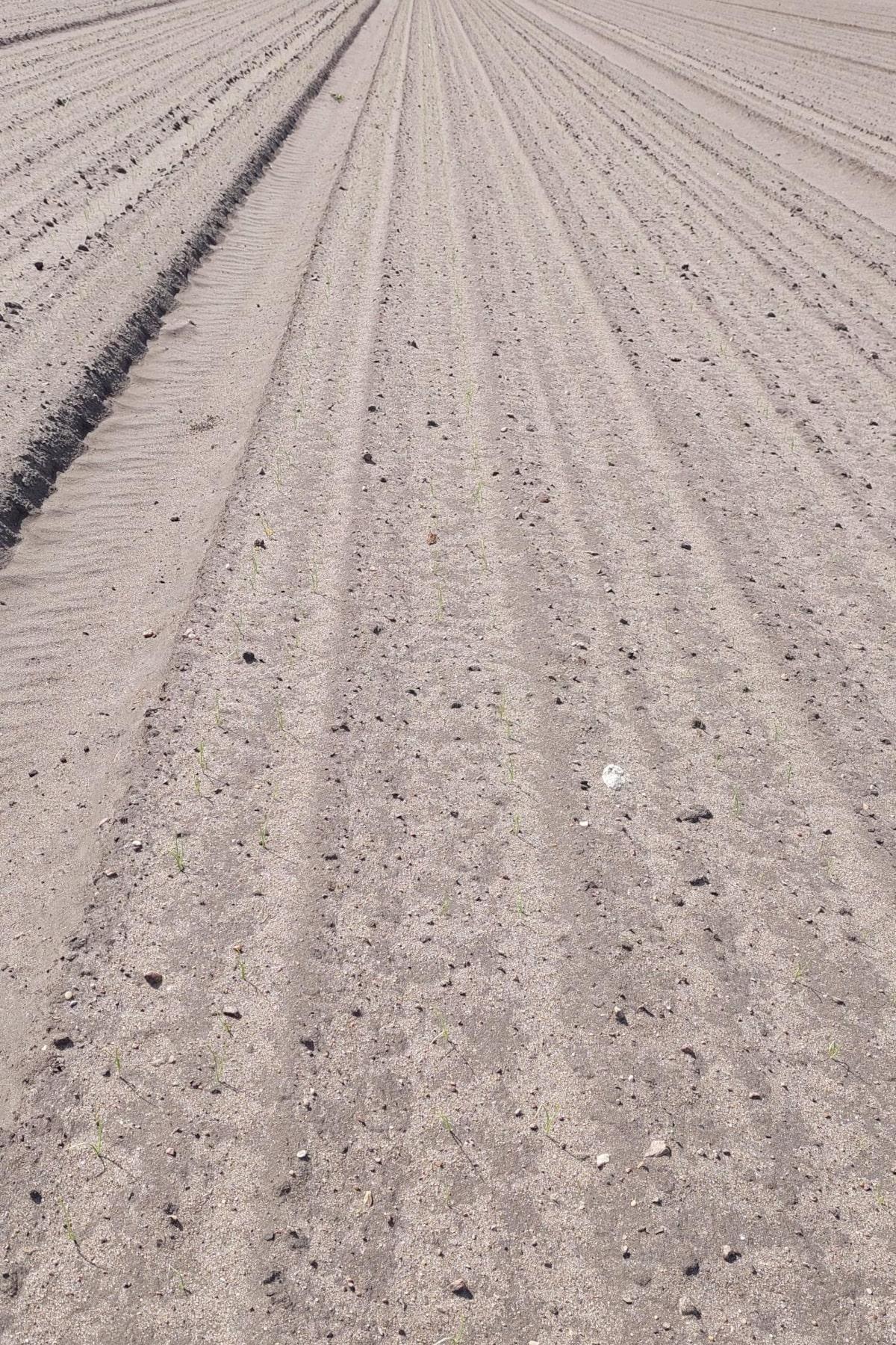 Na glebach lekkich występuje ponadto bardzo duży problem z erozją wietrzną. Szczególnie zauważalne jest to w regionie Kujaw i Wielkopolski, ale zjawisko nie jest obce producentom z innych regionów Polski. Co to oznacza? Tak jak wspominaliśmy, wierzchnie warstwy gleby są pozbawione wody. Wiatr zwiewa ziarenka piasku, które z dużą siłą „tną” siewki. Poniżej zamieszczamy zdjęcia siewek na polu, na którym wystąpiła erozja wietrzna (Fot. Aleksandra Czerwińska-Nowak).