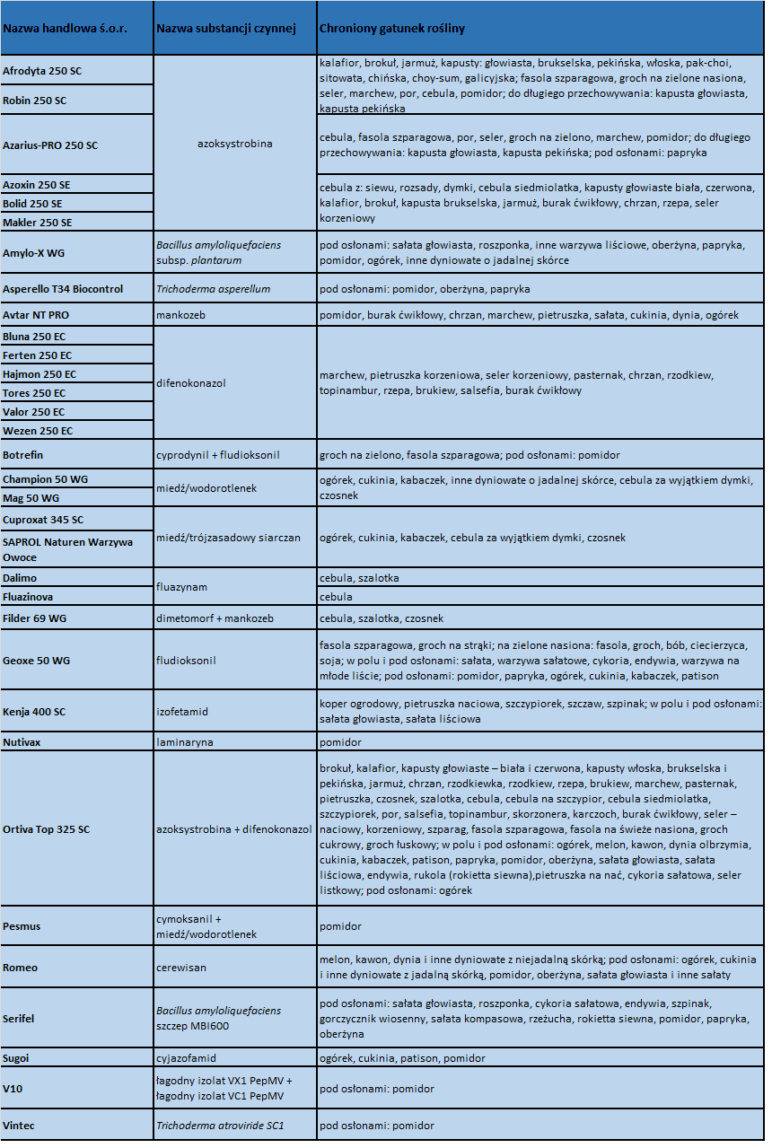 Tabela 1. Fungicydy – nowości w „Programie Ochrony Roślin Warzywnych na 2020 r.