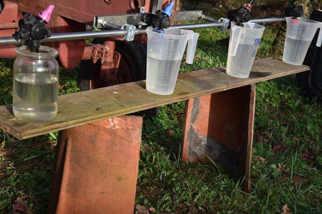 Dokonujemy następnie pomiaru ilości cieczy zebranej w każdym naczyniu przy znanym ciśnieniu (z reguły 3 barów) w czasie jednej minuty. Mogą to być naczynia bez naniesionej skali (na przykład większe słoiki) ale ilość cieczy z każdego z nich odmierzamy na wyskalowanym kubku pomiarowym (menzurze). Uzyskane wyniki porównujemy z danymi tabelarycznymi lub przynajmniej z wydatkiem uzyskanym z rozpylacza nowego nieużywanego, który pełni rolę referencyjnego.