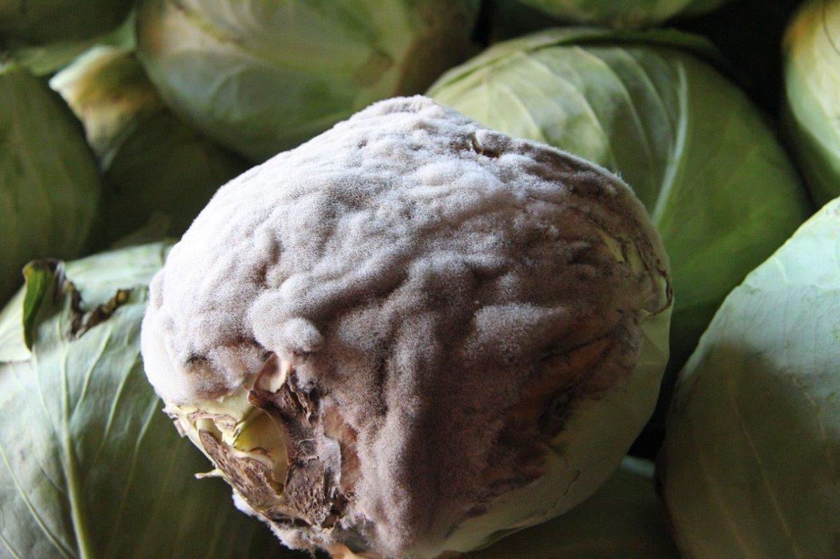 ? szara pleśń – na zainfekowanych główkach kapusty powstają brązowe, wodniste plamy. W warunkach wysokiej wilgotności powietrza oraz chłodnej pogody na plamach pojawia się szary pylisty nalot złożony z zarodników konidialnych. Zarodniki te dokonują kolejnych infekcji. Szara pleśń może rozwijać się na główkach podczas przechowywania.