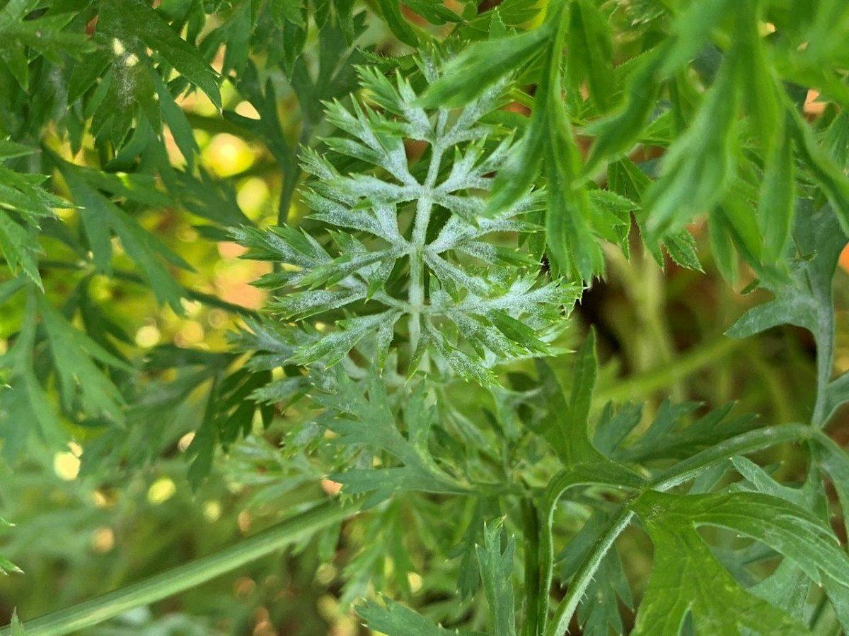 Mączniak prawdziwy na marchwi pojawia się w postaci białomączystego nalotu na obu stronach blaszki liściowej, a później również na ogonkach liściowych. Biały nalot grzybni z czasem staje się szarobiały. Silnie porażona nać żółknie i obumiera. Sprawca mączniaka prawdziwego szybko rozwija się w pogodne i suche lato. Rozwojowi choroby sprzyja wysoka temperatura, powyżej 20°C. Kiełkowanie zarodników może następować, gdy liście są zwilżone, ale trzeba pamiętać, że do infekcji może dojść już przy krótkotrwałym zwilżeniu np. podczas rosy.