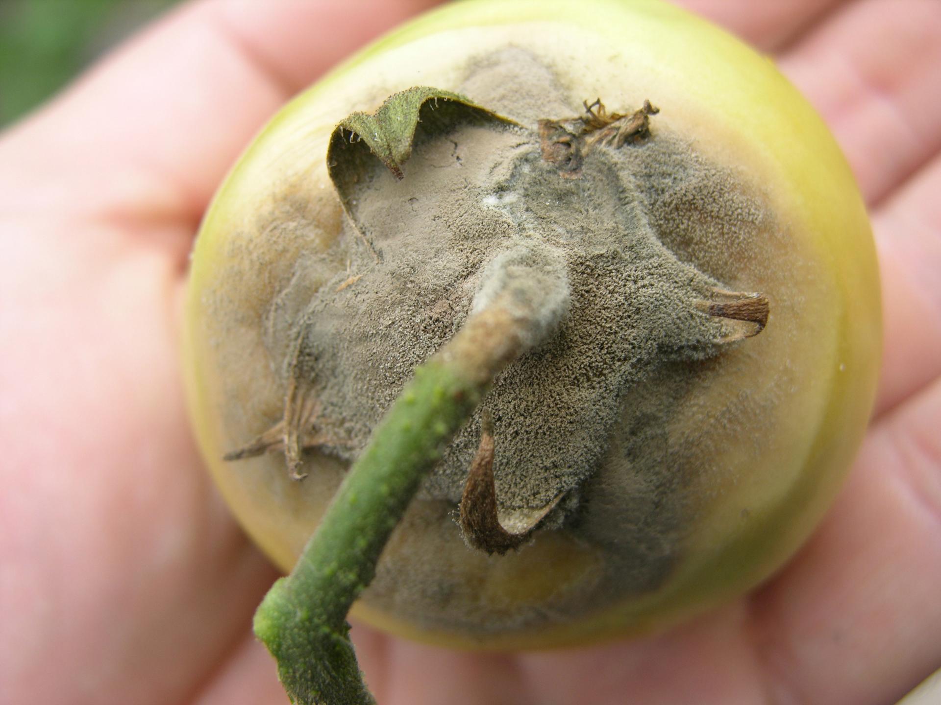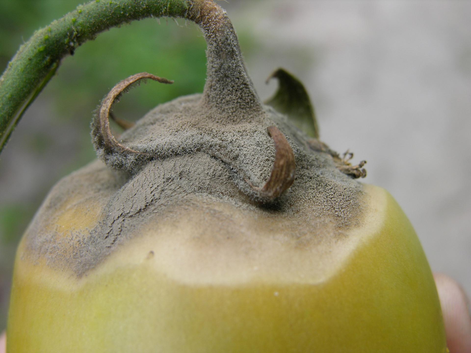 Jak już wspomniano, rośliny pomidora i ich owoce mogą być porażane przez wiele patogenów grzybowych, takich jak zaraza ziemniaka, alternarioza, antraknoza i w końcu szara pleśń. Ten ostatni patogen jest najgroźniejszy w okresie owocowania. Jeżeli jest dość wilgotno, a łan roślin jest zwarty, to zawiązane owoce tuż przy szypułce gromadzą na swojej powierzchni wilgoć, w związku z czym w tym właśnie miejscu może dochodzić do infekcji szarą pleśnią. Takie owoce, zarówno zielone, jak i czerwone, pokrywają się wówczas szarym nalotem grzybni z widocznymi zarodnikami konidialnymi.