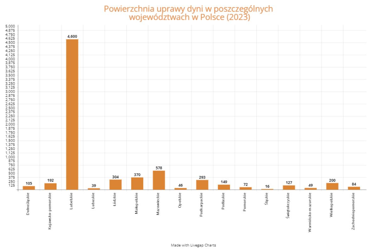 Zdecydowanym liderem w 2023 roku, jeśli chodzi o powierzchnię uprawy dyni w Polsce, pozostaje województwo lubelskie. W tamtejszych regionach rolnicy produkują bowiem warzywo na obszarze wynoszącym 4 600,23 ha. Jak to wygląda w innych lokalizacjach?