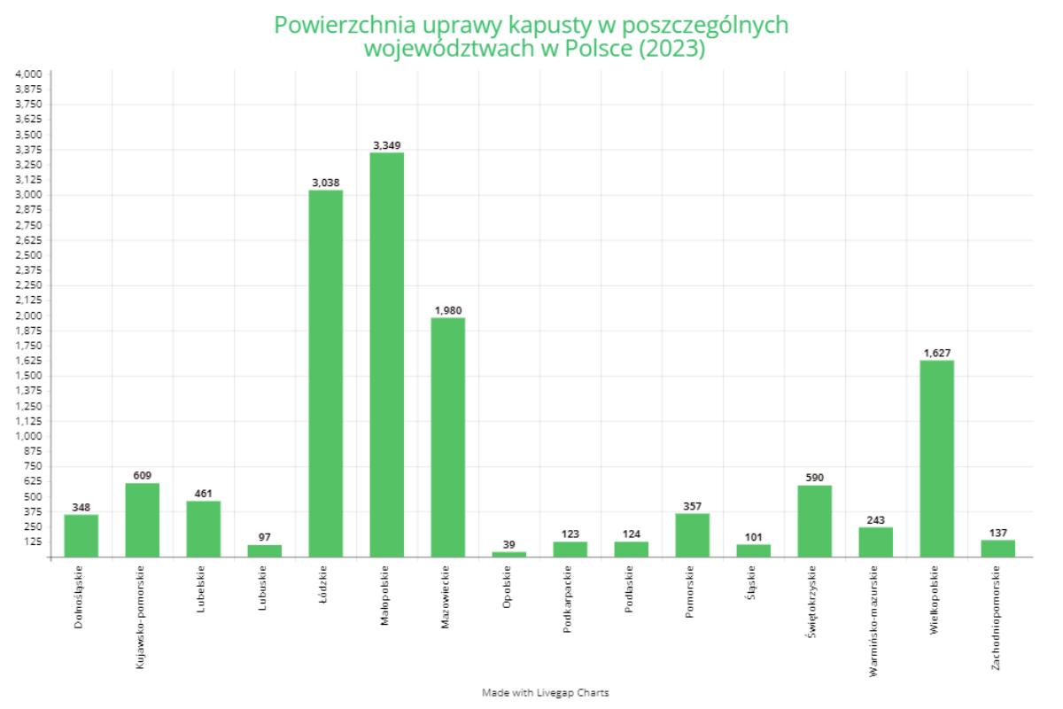 Spośród wszystkich wyróżnia się także województwo wielkopolskie, gdzie powierzchnia uprawy kapusty wynosiła 1 627,00 ha. W pozostałych przypadkach areał upraw jest już znacznie niższy. Warto zauważyć, że wskazane dane pochodzą z ARiMR i zostały sporządzone na podstawie deklaracji we wnioskach o płatności bezpośrednie.