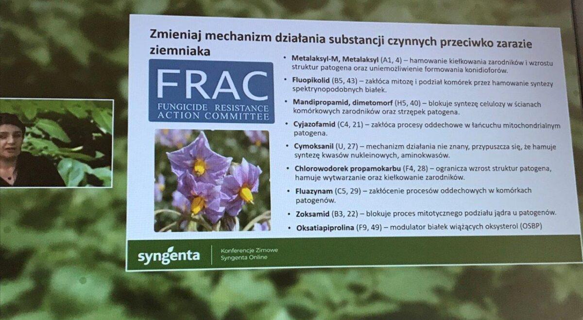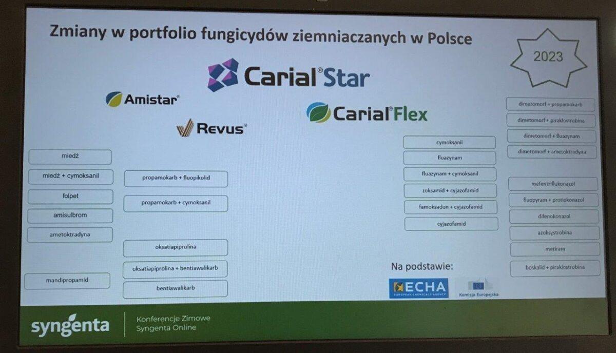 Prezentowano wyniki z różnych lokalizacji z oceny środków Carial Flex oraz Carial Star. Dr Katarzyna Rębarz informowała, że Polsce do tej pory nie notowano dużego nasilenia genotypów Phytophtora infestians, sprawcy zarazy ziemniaka, które wykazują odporność na fungicydy, ale w krajach Europy Zachodniej tych genotypów jest coraz więcej, dlatego tak ważne jest przemienne stosowanie środków, żeby ograniczyć uodparnianie się patogenów. W dalszej części sezonu ziemniakom zagraża alternarioza. Sporym problemem co roku jest też stonka ziemniaczana, na którą specjaliści polecali stosowanie środka Voliam. Zwrócono też uwagę na problem nicieni, do zwalczania których można wykorzystać produkt Nemathorin.