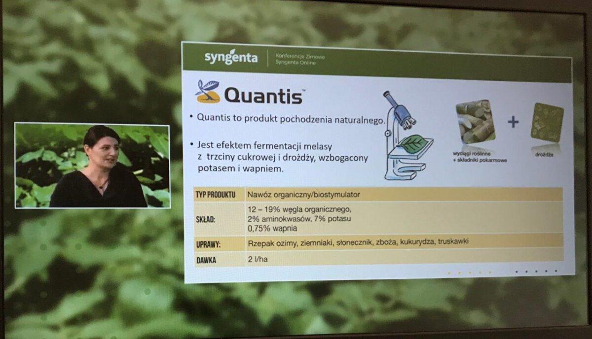 Kończąc wykład poświęcony ziemniakom prelegenci zachęcali do wypróbowania pierwszego biostymulatora z oferty firmy Syngenta – Quantis. Jest to produkt pochodzenia naturalnego, który pozwala na poprawę wzrostu roślin w warunkach stresowych. Lepsza kondycja roślin pozwala uzyskać wyższe plony dobrej jakości.