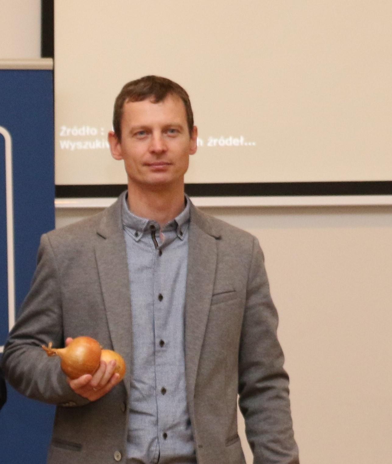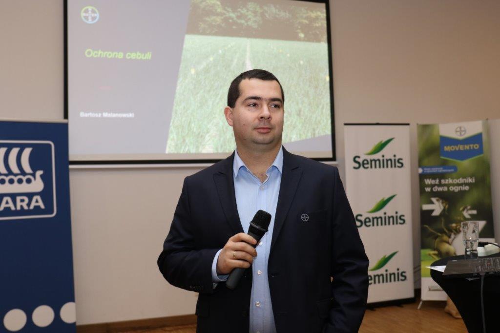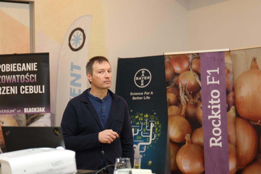 Bartosz Malanowski z firmy Bayer mówił o ochronie cebuli przed chorobami i szkodnikami. Informował, że największym problemem ostatnich lat jest susza. Przebieg pogody sprzyjał nadmiernemu rozwojowi szkodników. W uprawie cebuli spory problem stanowiło zwalczanie wciornastków. W tym roku plantatorzy mają do dyspozycji środek Movento. Bartosz Malanowski zaznaczył, że skuteczność tego środka ściśle zależy od warunków w jakich jest stosowany. Podkreślał, że wykonując zabiegi tym środkiem ważne jest, żeby rośliny były w dobrej kondycji i nie były narażone na stres związany z suszą. Polecał stosowanie tego środka z dodatkiem zwilżacza. Movento działa wyłącznie systemicznie. Musi krążyć wraz z sokami rośliny. Prelegent wspomniał też o środku Decis, który należy do pyretroidów. W ochronie cebuli przed wciornastkiem specjalista zalecał wykonać pierwszy zabieg pyretroidem, a po 2 dniach zastosować Movento. Spośród innych środków w ochronie cebuli rekomendował on np. Infinito 687,5SC – w walce z mączniakiem rzekomym i alternariozą, a także Fandango 200 EC – jako rozwiązanie na mączniaka i zgniliznę szyjki. Preparat ten wykazuje też działanie ograniczające rozwój Stemphylium. W celu zwalczania tej choroby prelegent polecał też Luna Experience 400 SC.