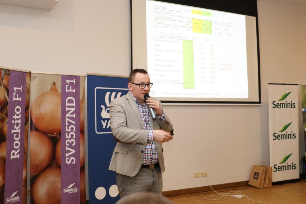 O sytuacji na rynku cebuli, wpływie pogody oraz doborze odmian mówił Mariusz Kąkol reprezentujący markę Seminis. Podkreślił, że szczególnie w ostatnich latach na plony cebuli wpływa pogoda. Na zmiany klimatu plantatorzy nie mają wpływu, ale jednym z rozwiązań tej trudnej sytuacji jest dobór odpowiednich odmian. Prelegent zaznaczył, że marka Seminis oferuje pełną gamę odmian cebuli od hiszpańskich po Rijnsburgery. Z odmian w typie hiszpańskim Mariusz Kąkol zachęcał do uprawy odmiany SV4774NW F1, a spośród nowości w typie Rijnsburger polecał m.in. wczesną Shakito F1 oraz dwie późniejsze – Packito F1 (polecana „na worek”) i Bossito F1 (uniwersalna odmiana, może być długo przechowywana, ma zdrowy i silny szczypior, tworzy duże cebule).