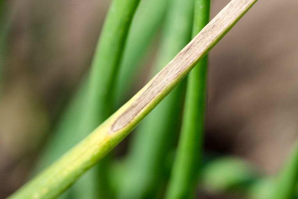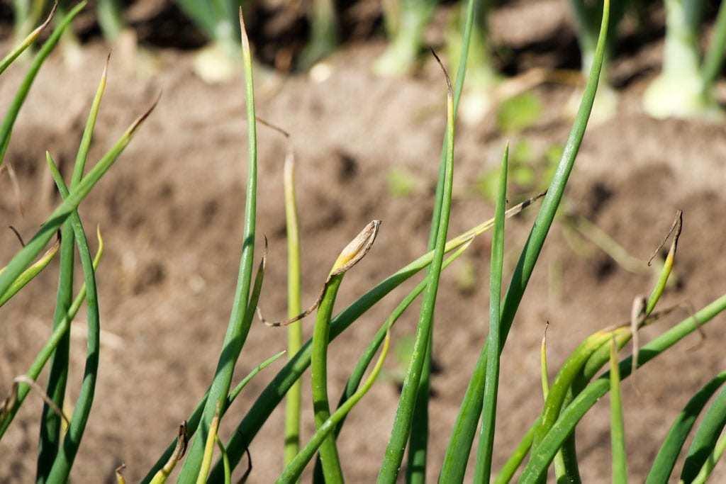 Nieco później, ok. 4 czerwca masowo nalatywał na uprawy wciornastek tytoniowiec. Stemphylium (fot. 6) obserwuje natomiast na roślinach od 11 czerwca, przy czym warunki klimatyczne tak stymulują do rozwoju sprawcę, że z końcem tego miesiąca wszystkie rośliny na plantacji były porażone. Rozpoczęcie obserwacji dopiero pod koniec czerwca może być obarczone znacznym błędem, gdyż działanie Stemphylium vesicarium jest maskowane przez wtórne porażenie chorych/zniszczonych tkanek grzybami z rodzaju Alternaria (fot. 7). Jak informował Piotr Borczyński, doradca warzywniczy, S. vesicarium występuje już znacznie wcześniej – w tym sezonie obserwował objawy na siewkach cebuli ok. 10 maja.