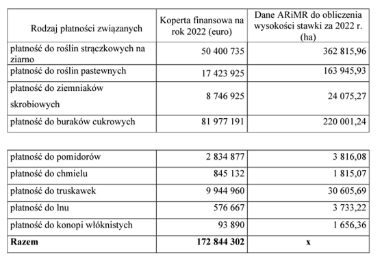 W efekcie stawka płatności związanych do powierzchni upraw za 2022 r. będą wynosić w przypadku płatności do:
