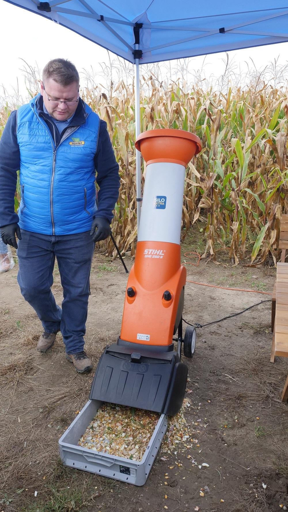 Po prezentacji odmian na przykładzie kukurydzy DKC3201 Wojciech Pieczewski omówił zagadnienie właściwej technologii, przygotowania kiszonki, a także temat badania wilgotności oraz zorganizował krótki pokaz siekania.