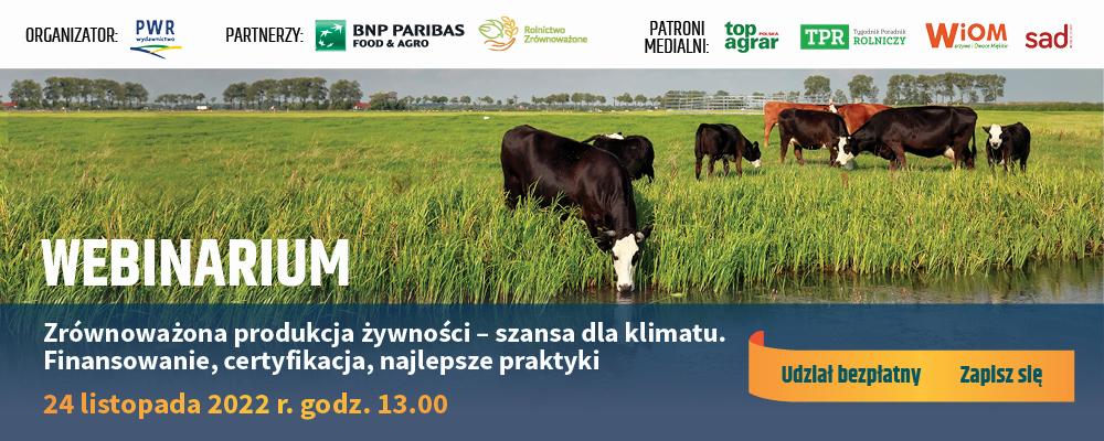Już w czwartek 24 listopada Polskie Wydawnictwo Rolnicze, wydawca m. in. takich czasopism i portali jak Top Agrar Polska, Tygodnik Poradnik Rolniczy,WiOM Warzywa i Owoce Miękie czy Sad Nowoczesny wspólnie z Bankiem BNP Paribas oraz Polskim Stowarzyszeniem Rolnictwa Zrównoważonego „ASAP” zapraszają na webinarium pt.: „Zrównoważona produkcja żywności - szansa dla klimatu. Finansowanie, certyfikacja, najlepsze praktyki”.