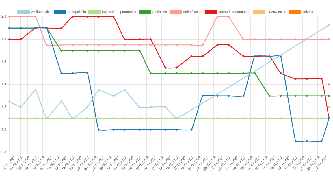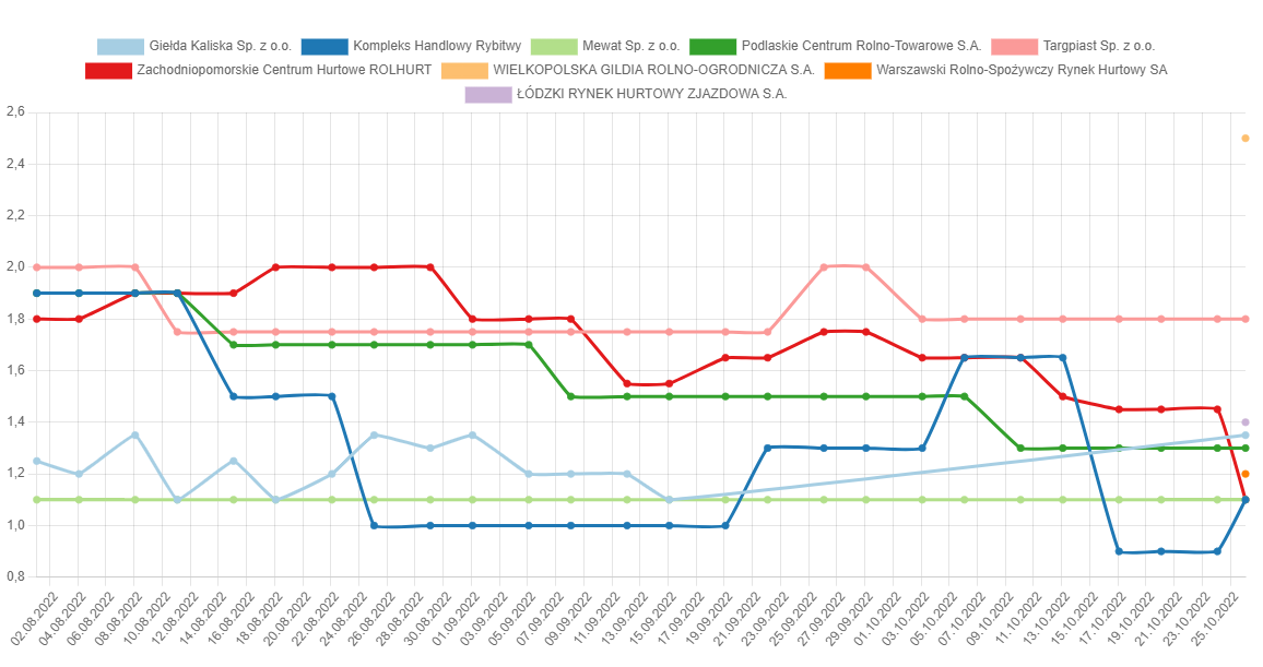 Czynniki te, nie wpłynęły jednak negatywnie na cenę, ta ciągle utrzymuję się na dość wysokim poziomie. Na koniec września ceny kształtowały się na rynkach hurtowych mniej więcej na poziomie od 0,80 do 1,00 zł/kg. W porównaniu z początkiem września był to wzrost o 12,5%. Jeżeli porównać te ceny do analogicznego okresu z roku 2021, jest to zwyżka o wielkości 32%.