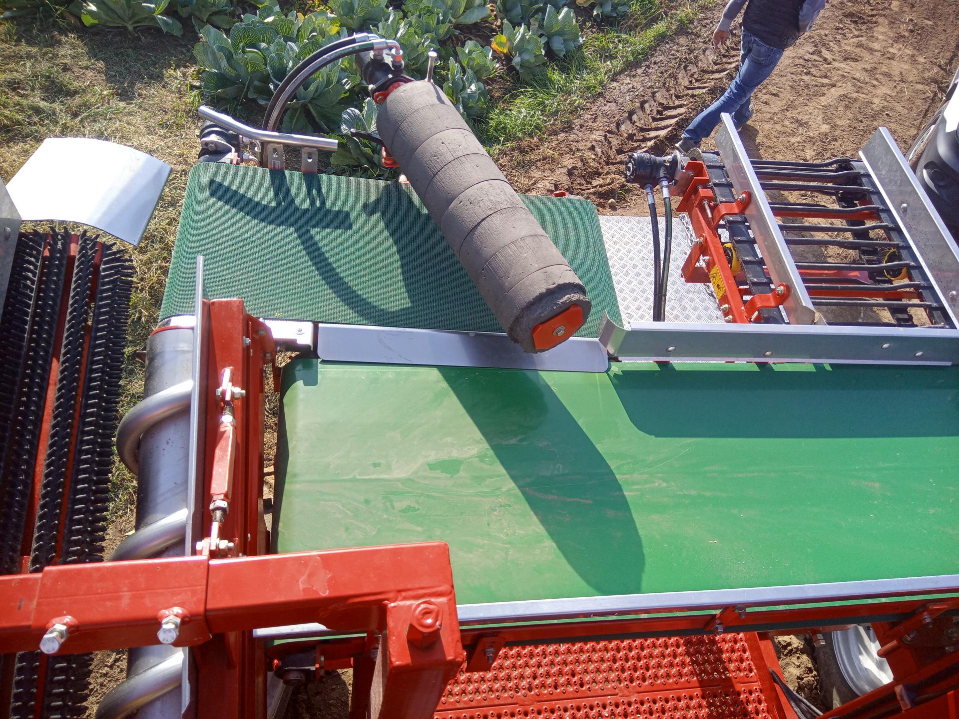 Główki zjeżdżają na prostopadły taśmociąg inspekcyjny, niemający żadnych kręcących się wałków przegarniających (kapusta ma być traktowana jak najdelikatniej).