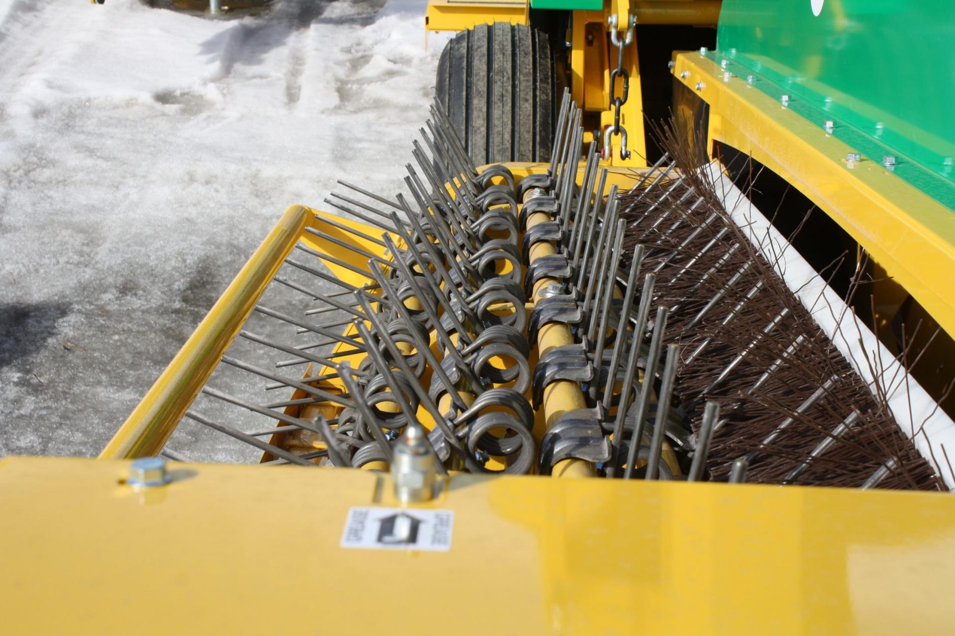 - Następnie ma miejsce ściąganie strąków. Elastyczne sprężyny, podobne do tych zagarniających z siewnika zbożowego, kręcą się na bębnie z dużą prędkością i zrywają towar, który ląduje na przenośniku taśmowym.