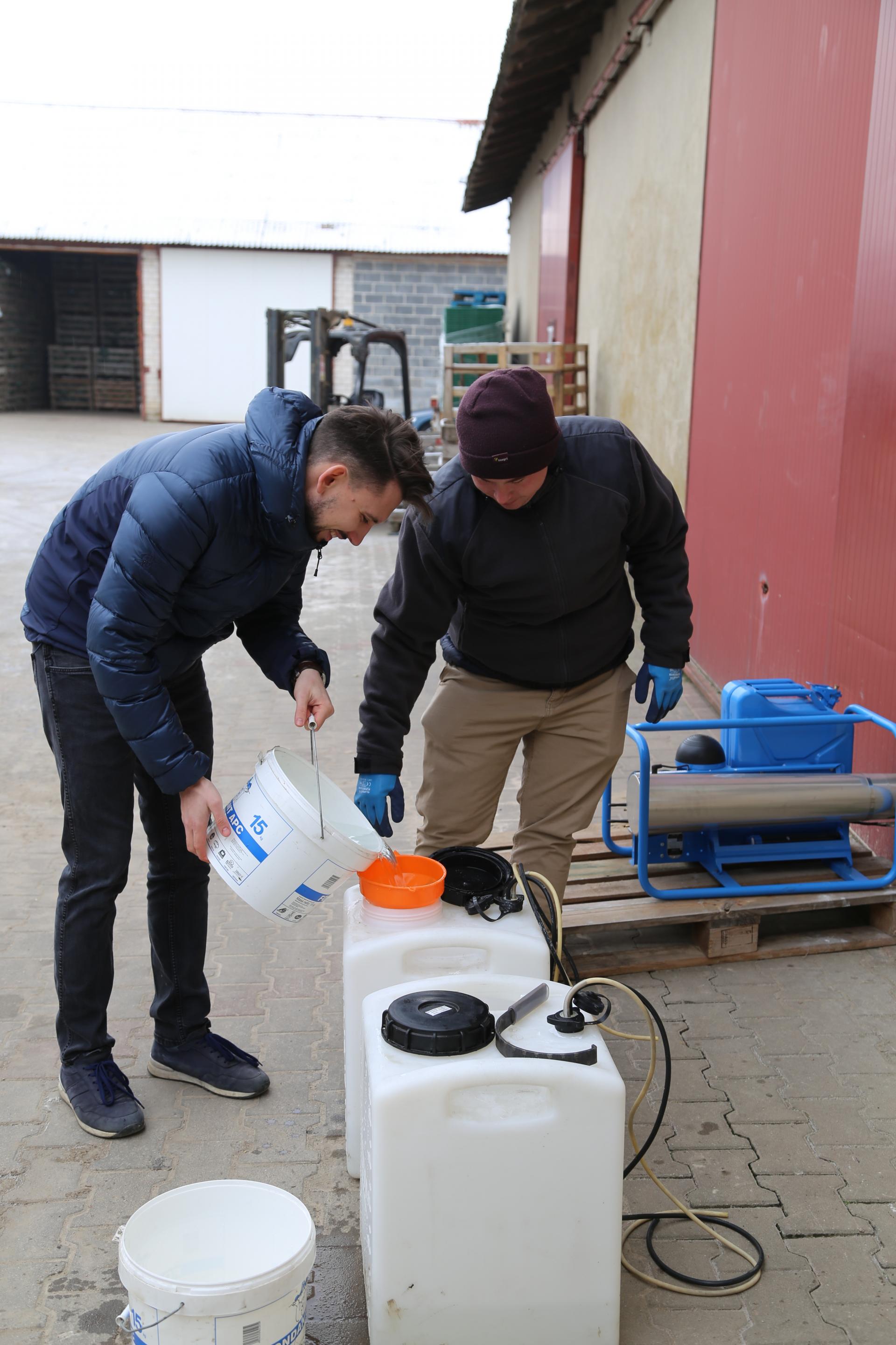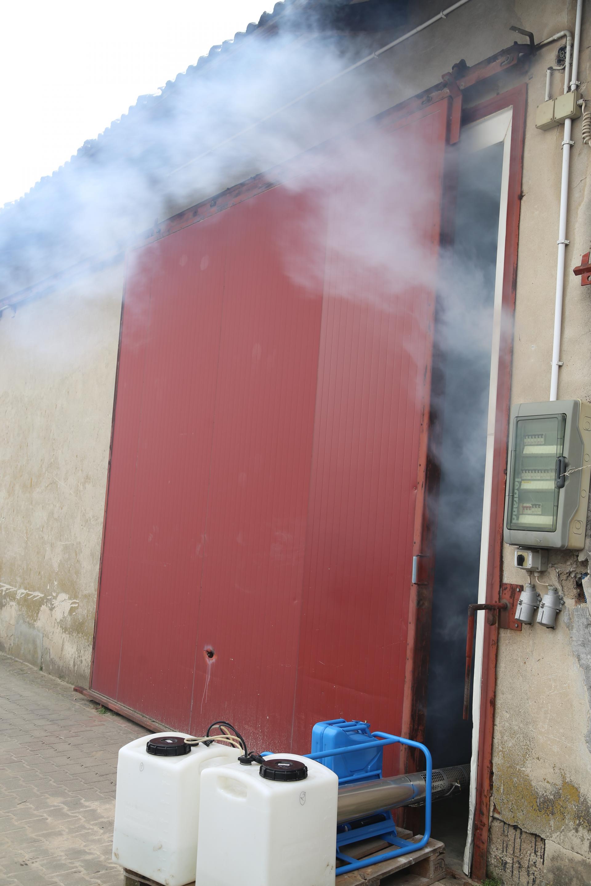 – Skrzynie można dezynfekować pojedynczo, wykorzystując preparat Huwa San TR 50 lub perhydrol, jednak jest to bardzo żmudny i pracochłonny zabieg. Aby usprawnić zabieg dezynfekcji, można użyć zamgławiacza Pulsfog. Przed zabiegiem skrzynie powinny zostać wstawione do komory przechowalniczej. Zabieg wykonuje się używając 20-proc. perhydrolu z dodatkiem specjalnego nośnika VK-2 Special. Ciecz robocza przetwarzana jest w gęstą mgłę i wtłaczana do komory przez okienko inspekcyjne. Po wykonaniu dezynfekcji komora powinna być szczelnie zamknięta przez minimum 48 godzin, aby preparat mógł dobrze spenetrować skrzynie. Zasada działania maszyny przy odkażaniu jest taka sama, jak przy zamgławianiu, jednak od osoby obsługującej Pulsfog wymaga szczególnych środków ostrożności. Ciecz chłodząca jest podawana na pierwszą parę dysz, a ciecz robocza na drugą.