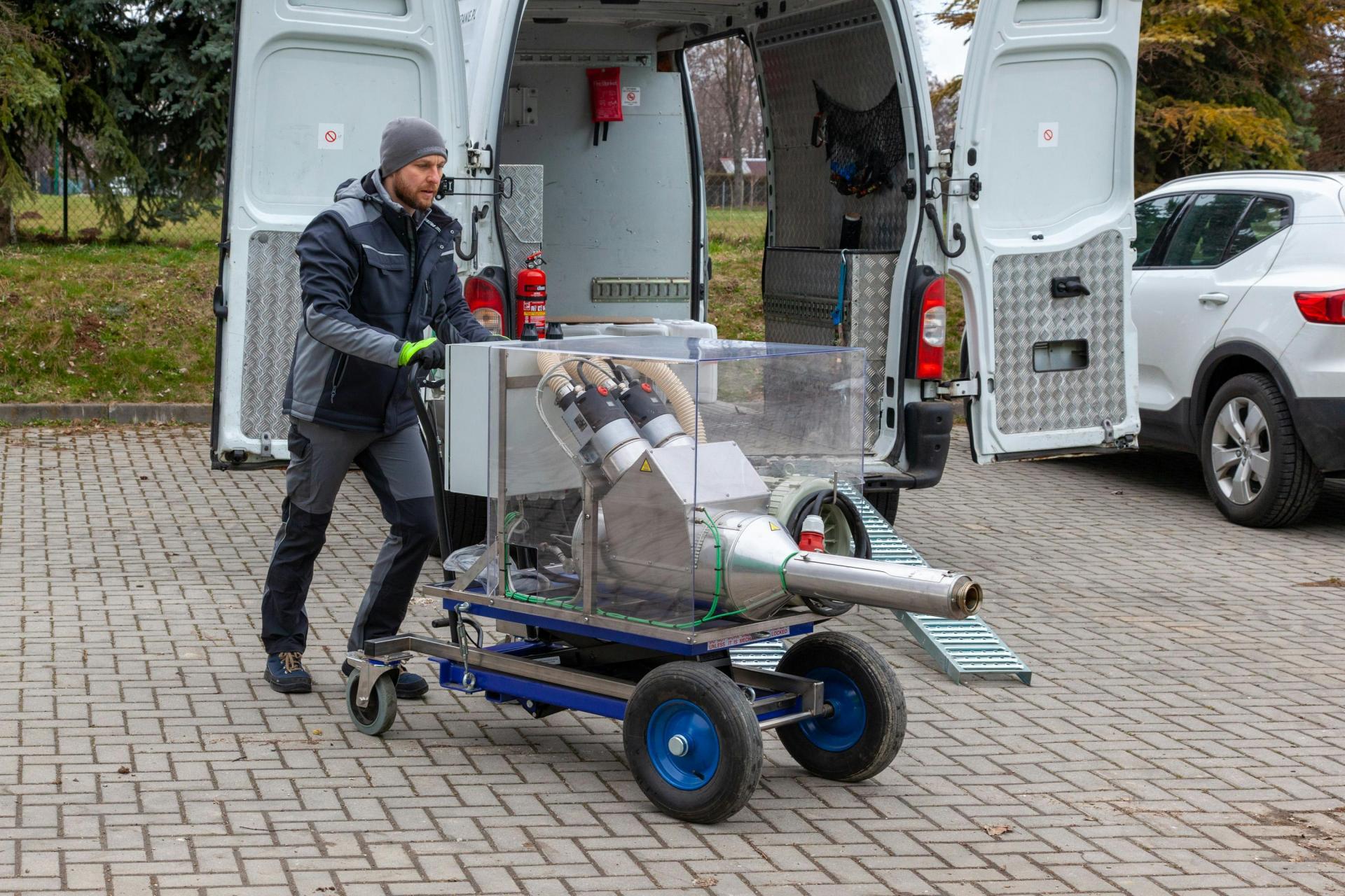 - Pojemnik zaopatrzony w pompę do mieszania wody wypełniamy letnią wodą i umieszczamy w niewielkiej odległości od drzwi chłodni.