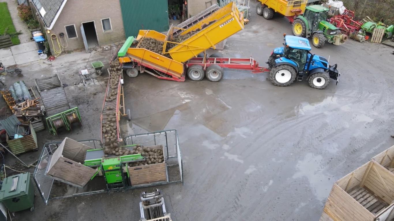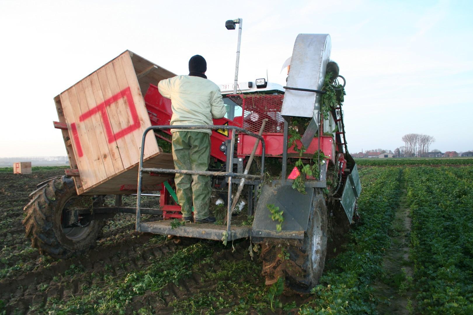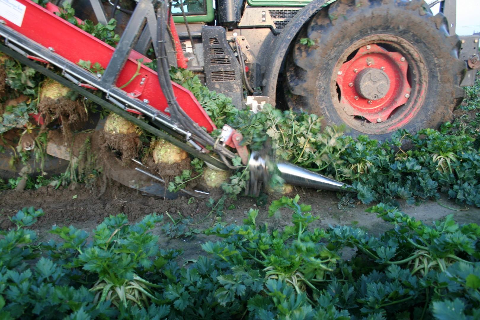 Gospodarze, mający kilkudziesięciohektarowe plantacje selera, nie uznają półśrodków. Gdy czas i pogoda gonią, korzystają z maszyn do buraków cukrowych. Zazwyczaj kombajn buraczany w jednym przejeździe ścina liście i bez używania zbiornika non stop wysypuje selery do transportujących przyczep. Metoda mało delikatna, ale efekt skali uprawy musi rekompensować straty. Jak można się spodziewać, na przyczepy trafia też sporo resztek liści i ziemi, więc doczyszczaniem zajmuje się kosz przyjęciowy z separatorami ziemi, a selery trafiają do kontenerów za pomocą usypywacza.