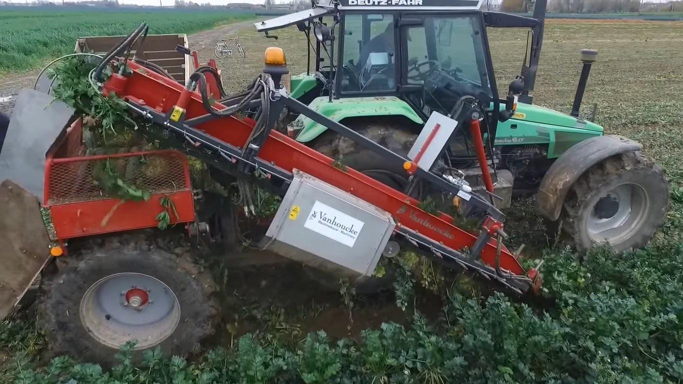 W koncepcję kombajnu do zbioru za nać wpisuje się kombajn belgijskiego producenta Vanhoucke, wymyślony stricte do selera korzeniowego. Maszyna jest zawieszana, jak jej marchwiowe odpowiedniki, na tylny TUZ i na siłownik z prawej strony ciągnika. Z przodu kombajnu są dwie torpedy ze stali nierdzewnej z gumowymi palcami, które podnoszą liście leżące na ziemi. Pod taśmami chwytnymi jest wklęsły nóż w kształcie księżyca, podcinający korzenie selera także wokół dolnej części rośliny. Nóż ma wysokość regulowaną za pomocą wrzeciona. Seler chwycony przez pasy jedzie w górę, będąc czyszczony po bokach dwoma cylindrami z gumowymi palcami. Liście są cięte na żądaną długość zestawem noży ze stali karbowanej jeszcze przed końcem pasów. O ile po ścięciu naci, marchew spada na taśmę transportera i jedzie do skrzyniopalety, tak seler w belgijskiej maszynie spada na kręcące się przeciwbieżnie metalowe walce (co drugi ma spiralę), doczyszczające ze zbędnych korzeni. Seler jest transportowany do pojemnika za pomocą płaskiej taśmy sitowej. Kontener stoi na obrotowym maszcie z widłami, zapewniając najmniejszą wysokość zrzutu. Maszyna jest standardowo wyposażona w podwójną pompę hydrauliczną oraz niezależny układ hydrauliczny.