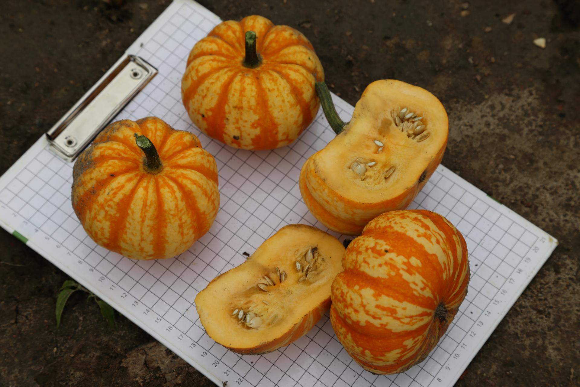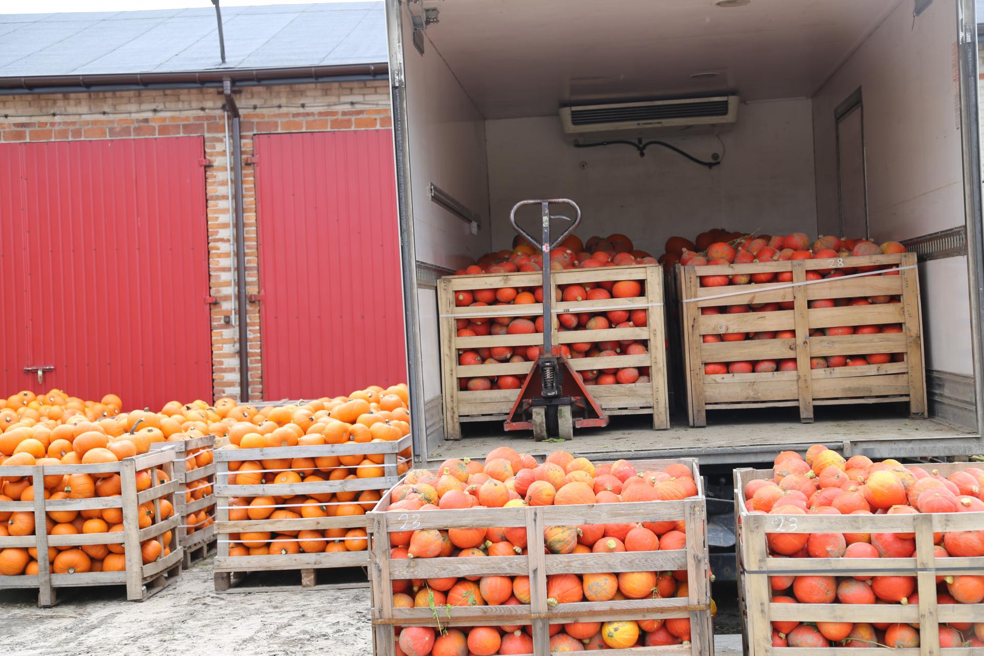 Na podwórzu gospodarstwa przegląd odmian dyni – kształtów i kolorów. Jedne w skrzyniopaletach, drugie przygotowane do czyszczenia. Odmiany pochodzą z czterech firm hodowlano-nasiennych: Sakata, Argenta Seeds, Enza Zaden i Clause (Hazera). Jest odmiana mieszańcowa w typie Halloween – Flynn – owoce okrągłe z lekkim rzeźbieniem, o średnicy 20–22 cm i wagą 3–4 kg. Reprezentuje średnio wczesny okres dojrzewania. Jak Halloween to również odmiana Spitfire, o podobnej masie owoców i Gomez, tworząca owoce 2–3-kilogramowe.
