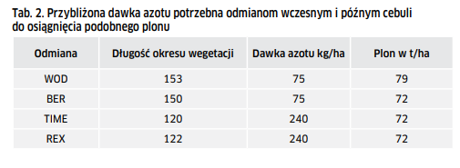 - Pod koniec pierwszej połowy sezonu wegetacyjnego cebula z siewu zawiera na ogół mniej niż 20% tego azotu, który znajdzie się w roślinach podczas zbioru. Chociaż pobór azotu w stadium siewek jest na początku niski, to jednak ograniczona jego dostępność na tym etapie może opóźnić tworzenie się główek cebuli i przez to dojrzewanie, podczas gdy nadmiar N w późniejszych stadiach może opóźnić dojrzałość przez zahamowanie starzenia się liści.