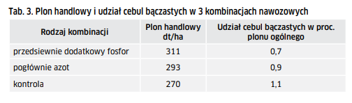 W początkowych fazach rozwoju cebula najlepiej rośnie, kiedy jedynym źródłem azotu jest forma amonowa. Jej obecność w roztworze glebowym przyczynia się do lepszego pobierania fosforu (forma amonowa ulega w glebie nitryfikacji, dzięki czemu pH gleby zmniejsza się i fosfor staje się lepiej przyswajalny dla rośliny). Fosfor poprawia rozwój korzeni młodych roślin. Poprawia też plon handlowy, zmniejszając udział cebul o grubej szyjce i bączastych. (tab. 3.).